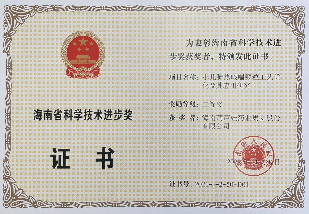 为此,小儿肺热咳喘颗粒的制备方法获得了第二十一届中国专利优秀奖(2019年),专利申请号:ZL201010134951,此次作为专利技术的应用,获得了2021年度海南省科学技术进步奖二等奖。在此之前,六合联盟牌小儿肺热咳喘颗粒还多次被授予“临床价值中成药品牌”、“中国连锁药店最具合作价值单品”,荣登“中国医药品牌榜”。